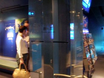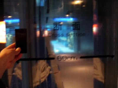 大水槽の横で、実際に使われている厚さが実感できるスペースも設けてありました。携帯と比較したらどのくらい厚いか分かると思います。