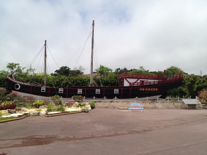 写真の船は、おきなわワールドの入り口にある琉球古船【進貢船(しんこうせん)】