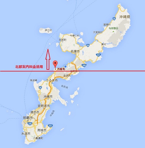 沖縄の国頭地区方面へはさらに長距離となりますので、追加料金をいただいております