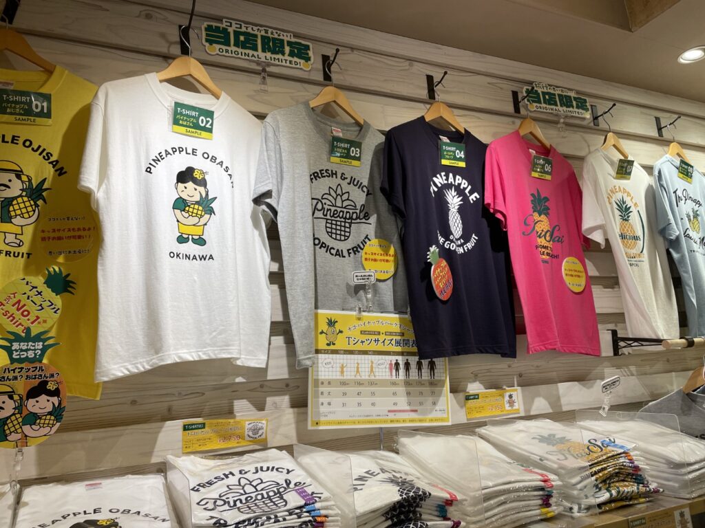 パイナップルパークのお土産には、パインにちなんだ沖縄らしいTシャツや、かわいらしいぬいぐるみ、グッズなど、沖縄らしさを楽しむことができるバラエティ豊かな品揃えが魅力です
