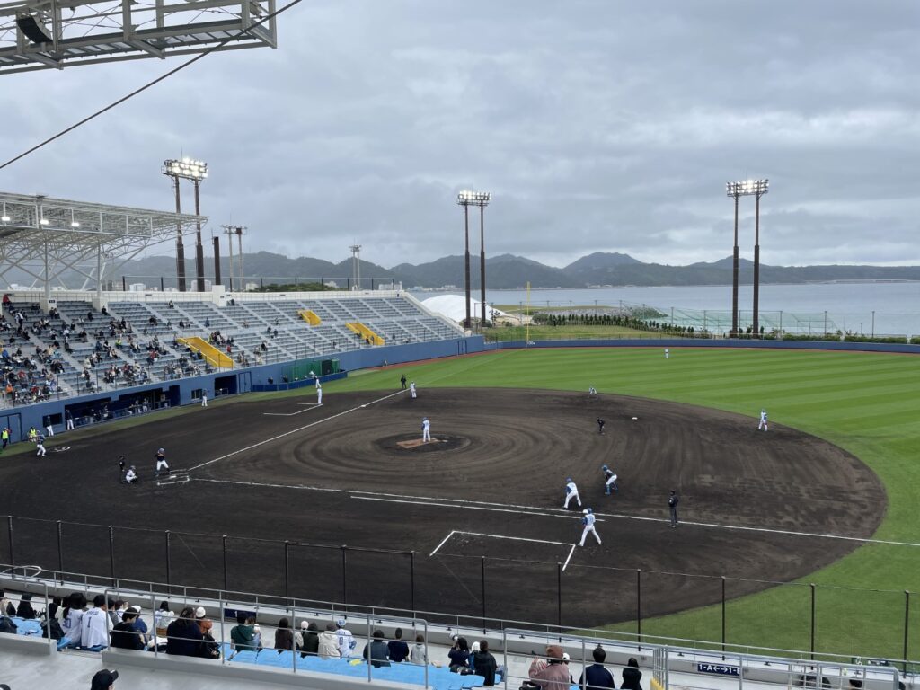 青い海がすぐ目の前にある名護市営球場は、熱気と活気に満ちていましたよ