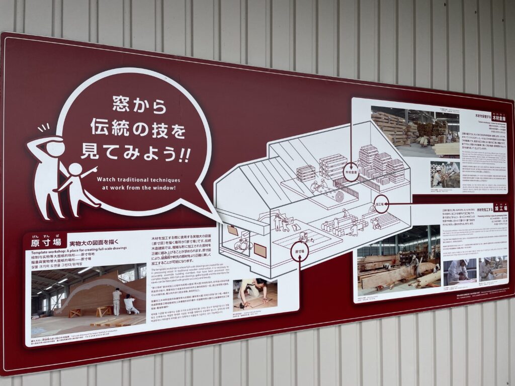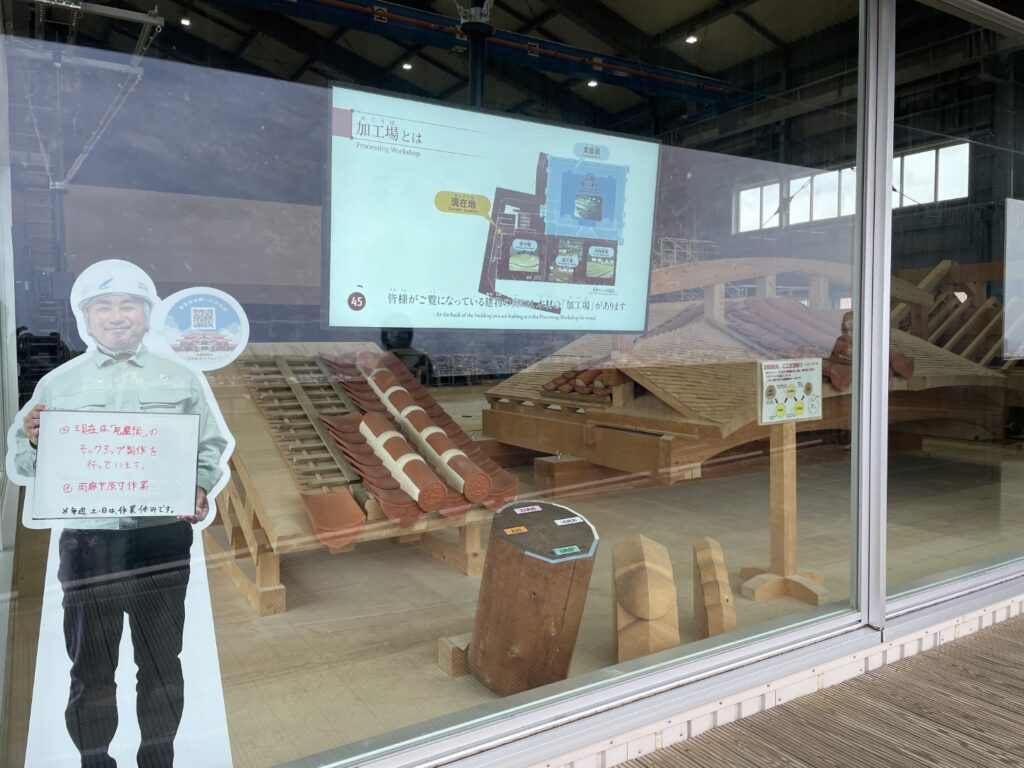 木材の組み上げ作業が進められるエリア。かつての匠の技術による精巧な木組みの様子が見られ、建築技術の高さを実感できます。