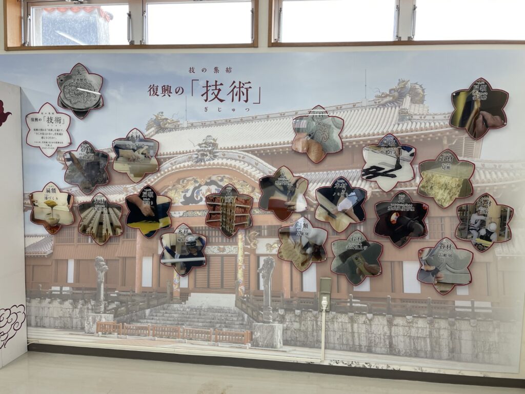 復元プロジェクトの詳細が展示されているエリア。火災後の復興の過程や、伝統技術を駆使した修復作業の詳細が紹介されています。