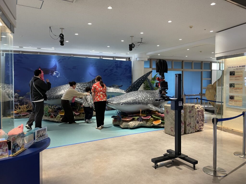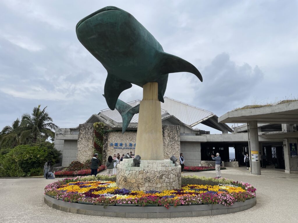 水族館の入り口付近にあるジンベエザメのモニュメントは、記念撮影にぴったりのスポット。