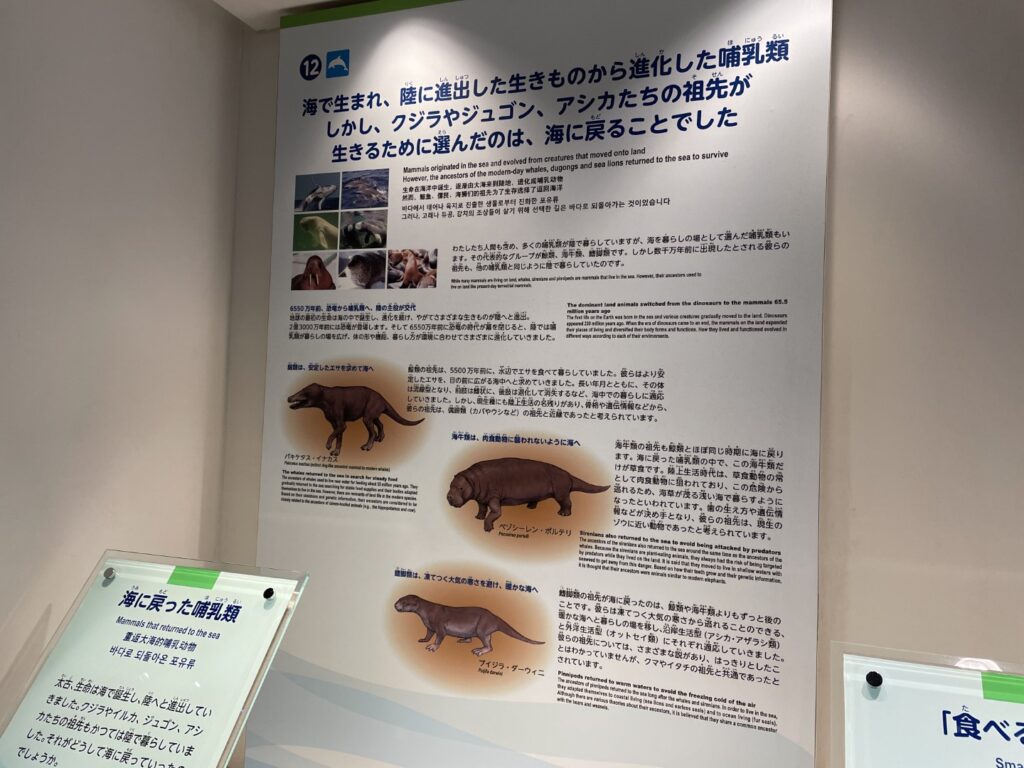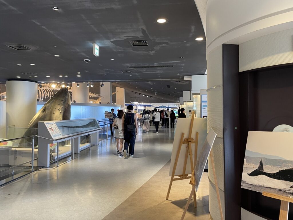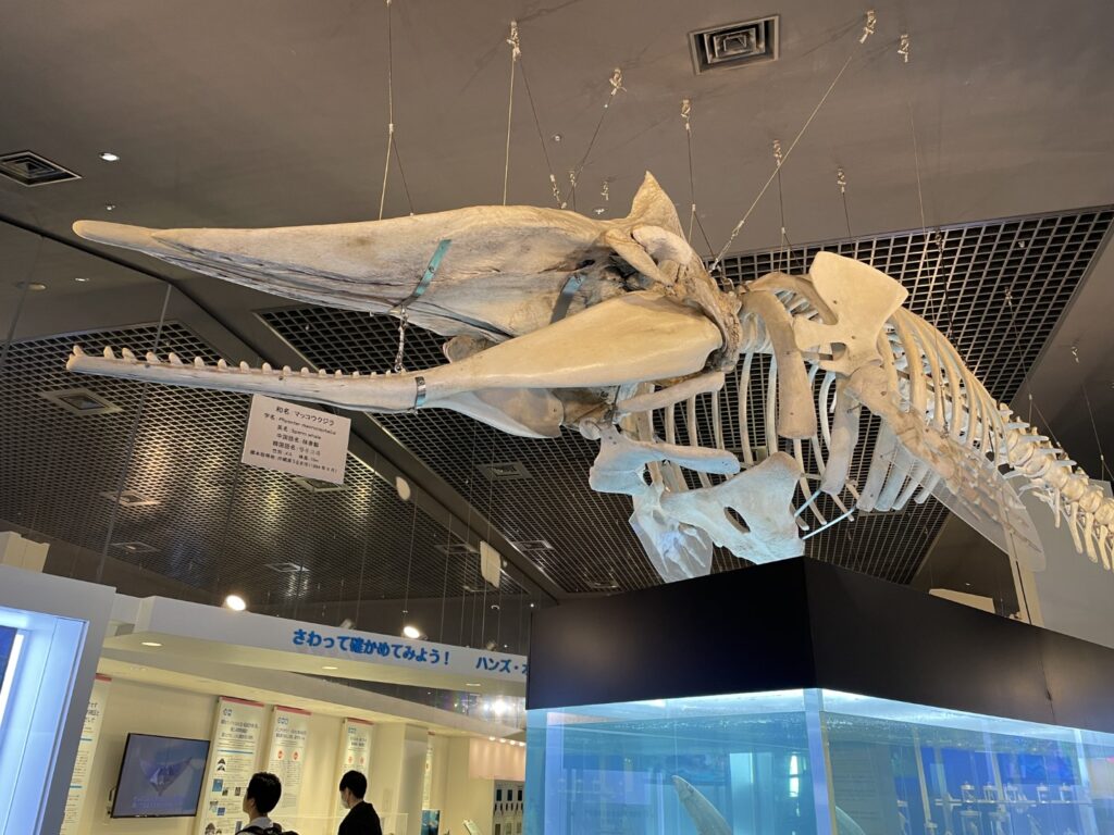 - マッコウクジラの尾ひれ模型と骨格: クジラの生態を学べるコーナーでは、マッコウクジラの尾ひれの模型や骨格標本が展示されており、巨大な海洋生物の構造を知ることができます。