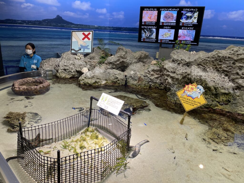 ヒトデやナマコ、小さな魚たちが岩陰に隠れたり、砂に潜ったりする姿はまるで宝探しのよう。