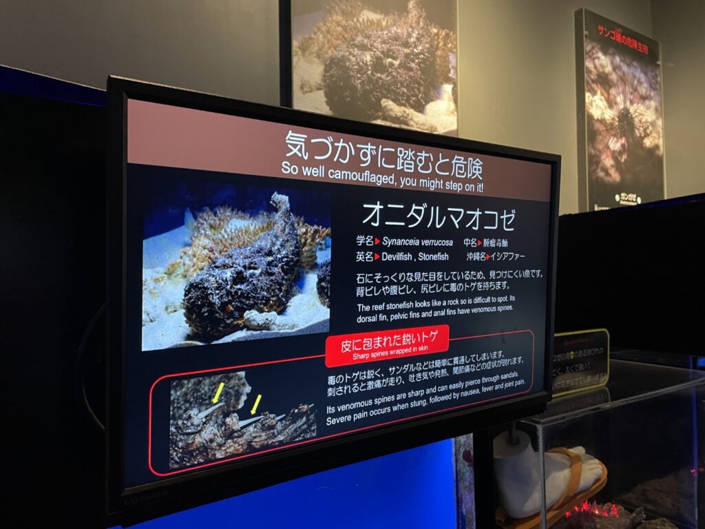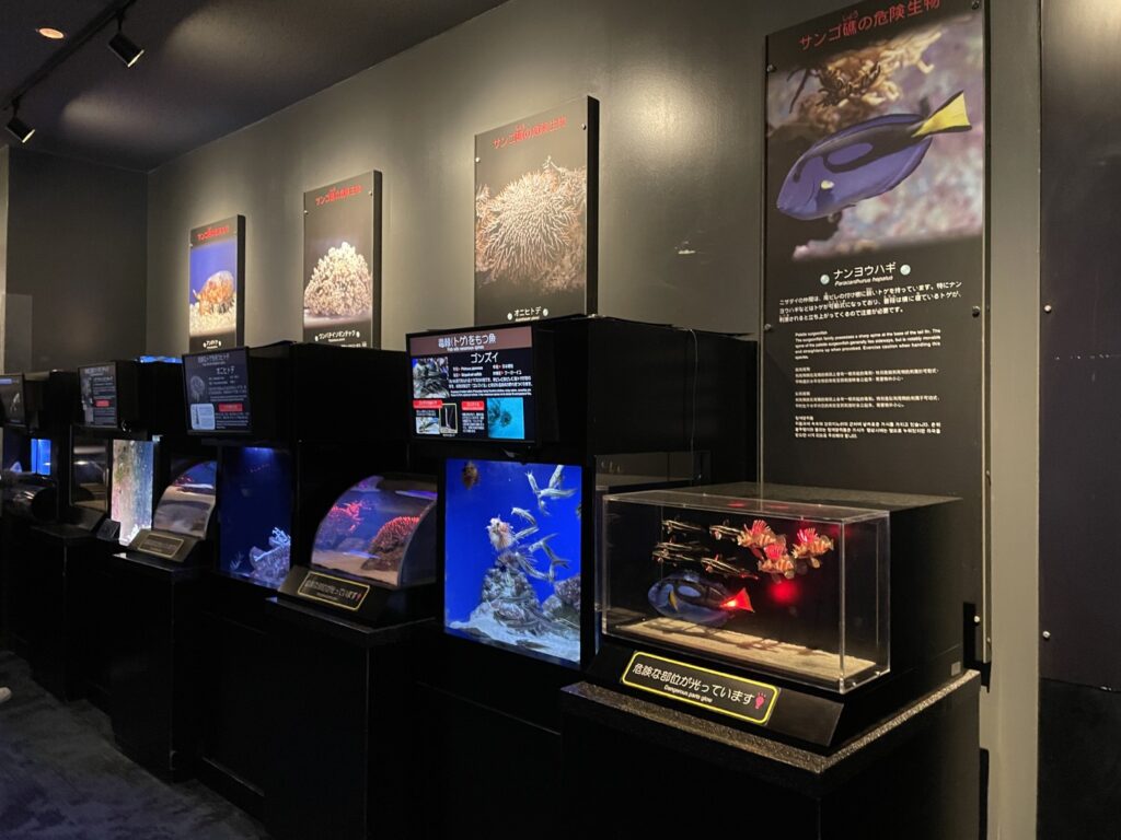 沖縄の海には、美しくも危険な毒を持つ生き物が生息しています。「サンゴ礁への旅」エリアでは、以下のような生き物も展示されています。