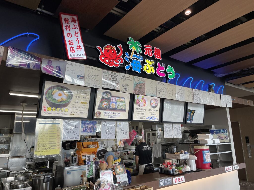 元祖海ぶどうのお店で、有名人のサインもたくさんありました