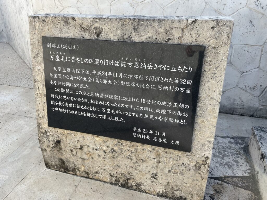 平成24年(2012年)には、当時の天皇皇后両陛下(現・上皇ご夫妻)が万座毛を訪れた際の記念碑も設置されています。