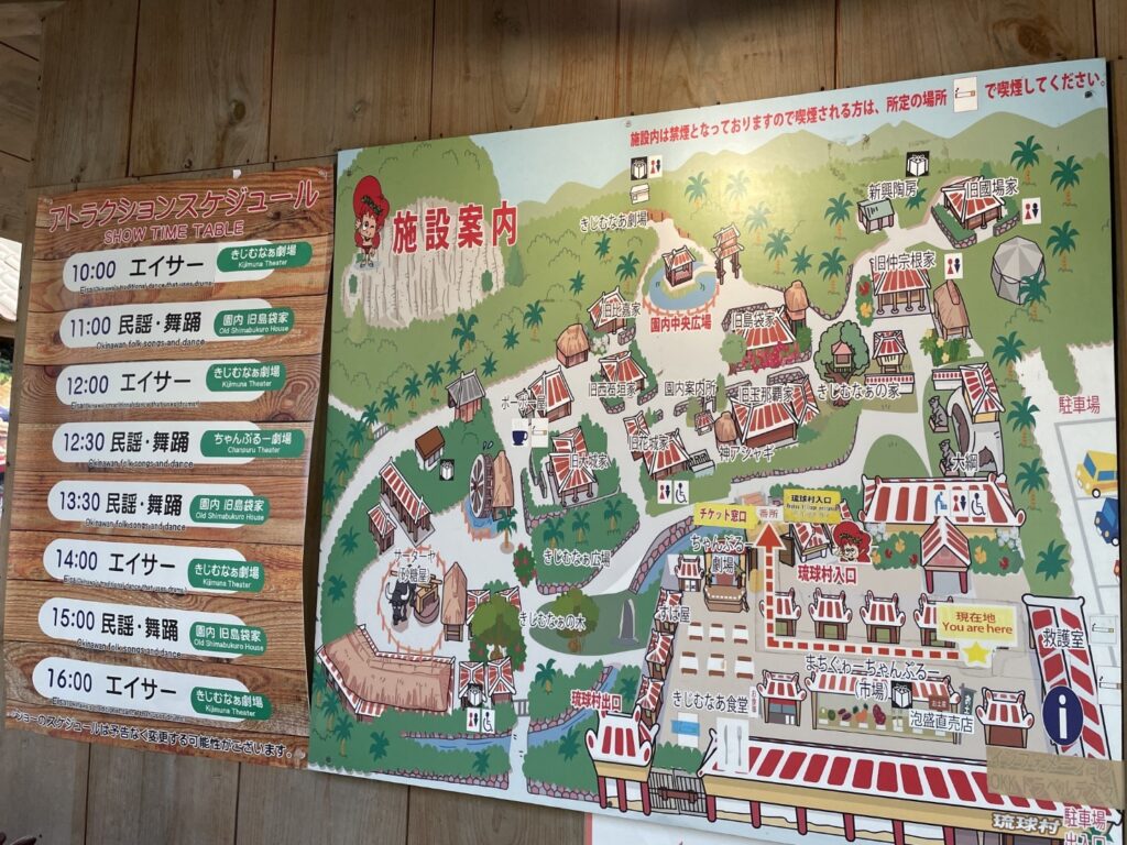 村内ではエイサー演舞や三線ライブが毎日開催され、迫力ある伝統芸能を間近で楽しめます。