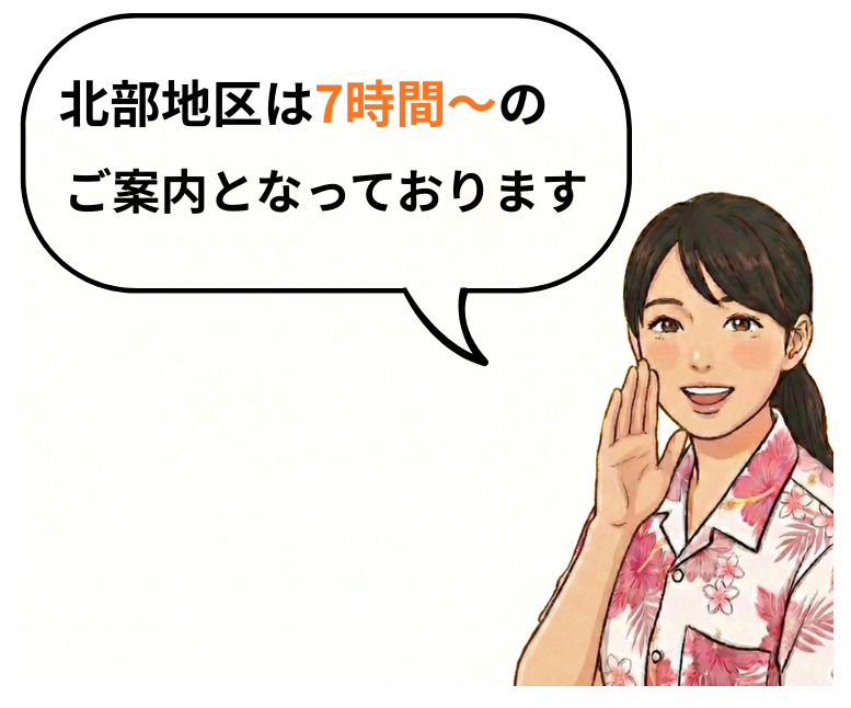北部地区より古宇利島、国頭地区方面(大宜見村、東村、国頭村)へはさらに長距離となりますので、追加料金をいただいております。