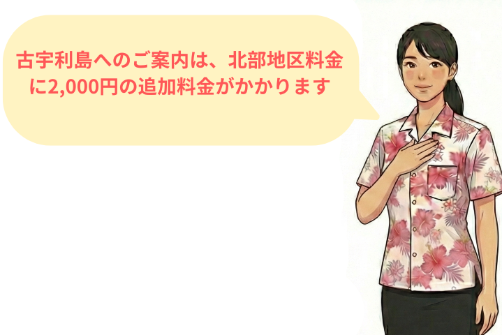 古宇利島方面へのご案内の場合に2,000円、辺戸岬・金剛石林山等の国頭地区は5,000円の追加料金をいただいております。
